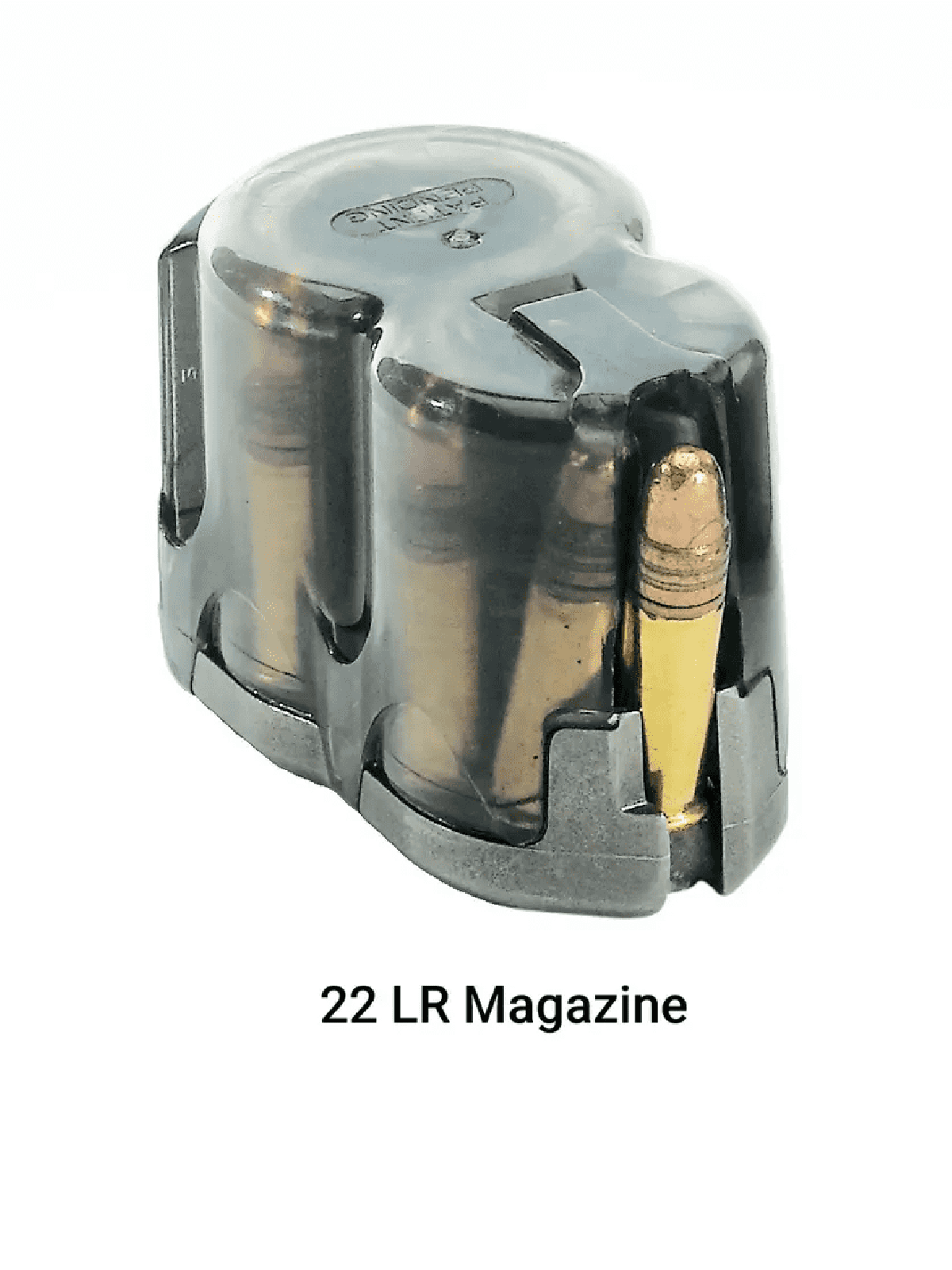 Mais fino, leve e fácil de manusear do que os carregadores rotativos de calibre .22 da concorrência, o Double Helix de dez cartuchos utiliza uma mola de torção e um sistema de engrenagens interligadas para manter a sincronização correta e o alinhamento preciso dos cartuchos, garantindo uma alimentação suave e confiável. O corpo cinza translúcido permite verificar facilmente a quantidade de cartuchos restantes. A munição pode ser removida movendo-se ligeiramente a engrenagem exposta para trás, permitindo a queda suave de cada cartucho sem a necessidade de ferramentas ou arranhões nos dedos.