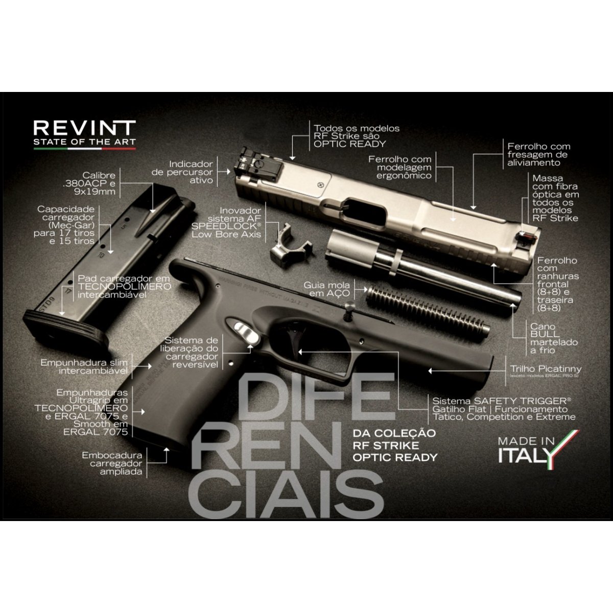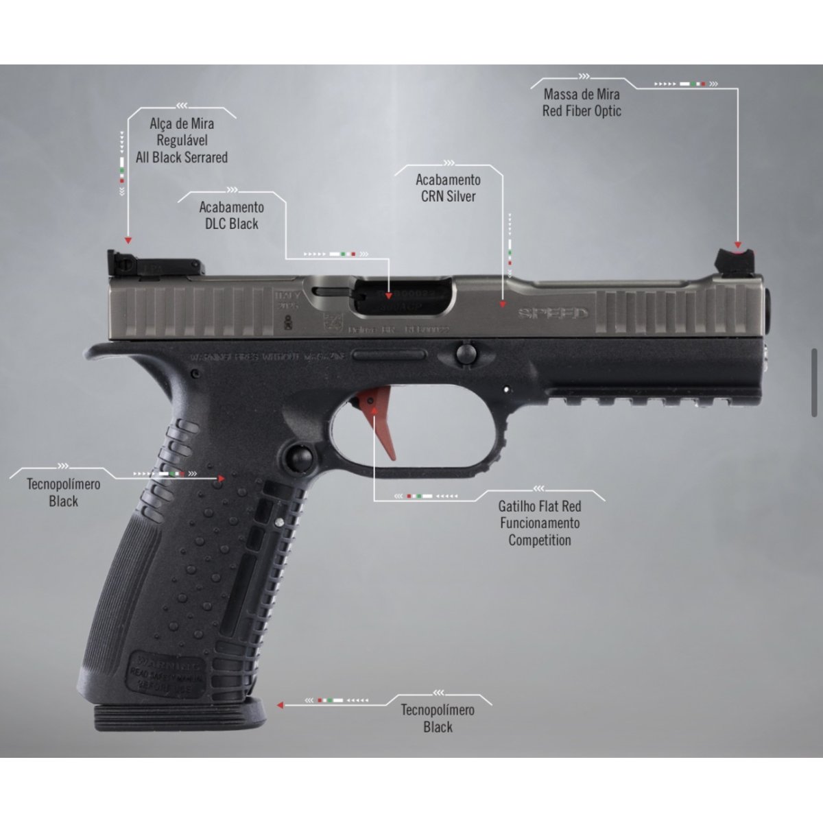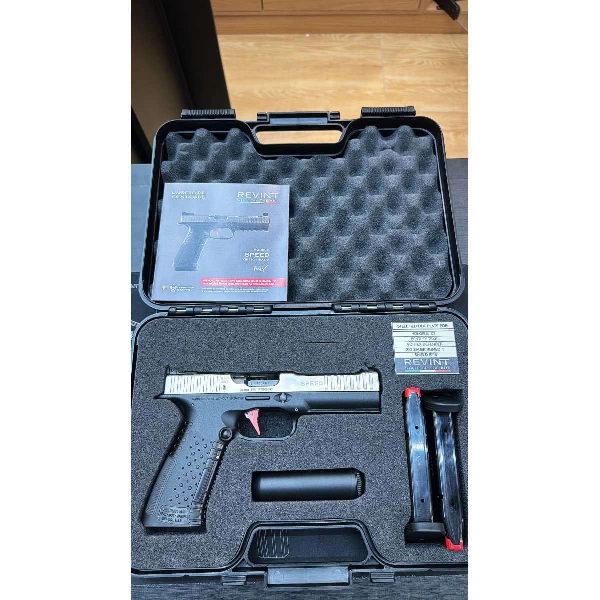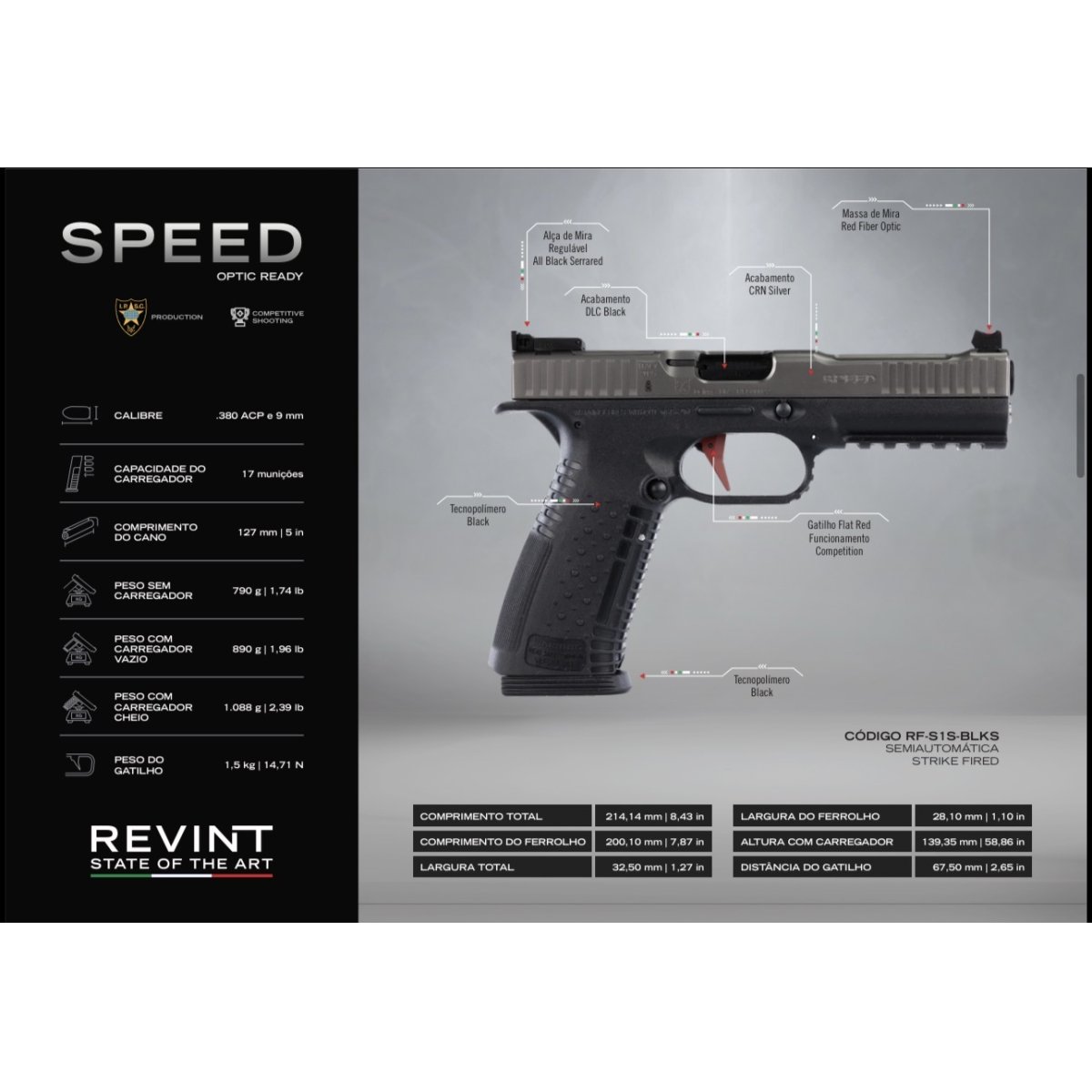 PISTOLA REVINT - SPEED- CAL. .380ACP - 17+1 TIROS (2 CARREGADORES) - CRN SILVER - CANO 5” - SEMIAUTOMÁTICA - PESO DO GATILHO EXTREME 1,5KG - ITÁLIA