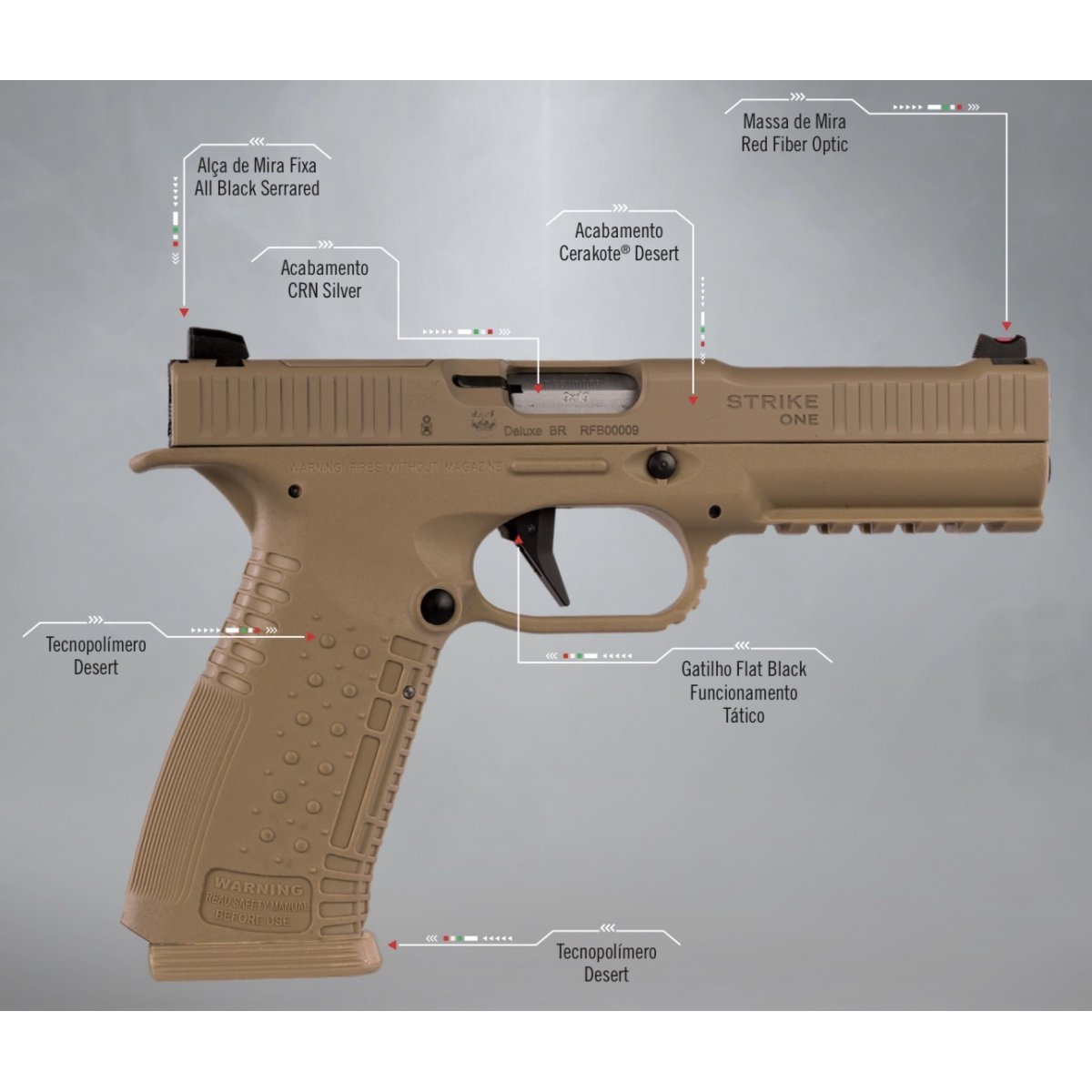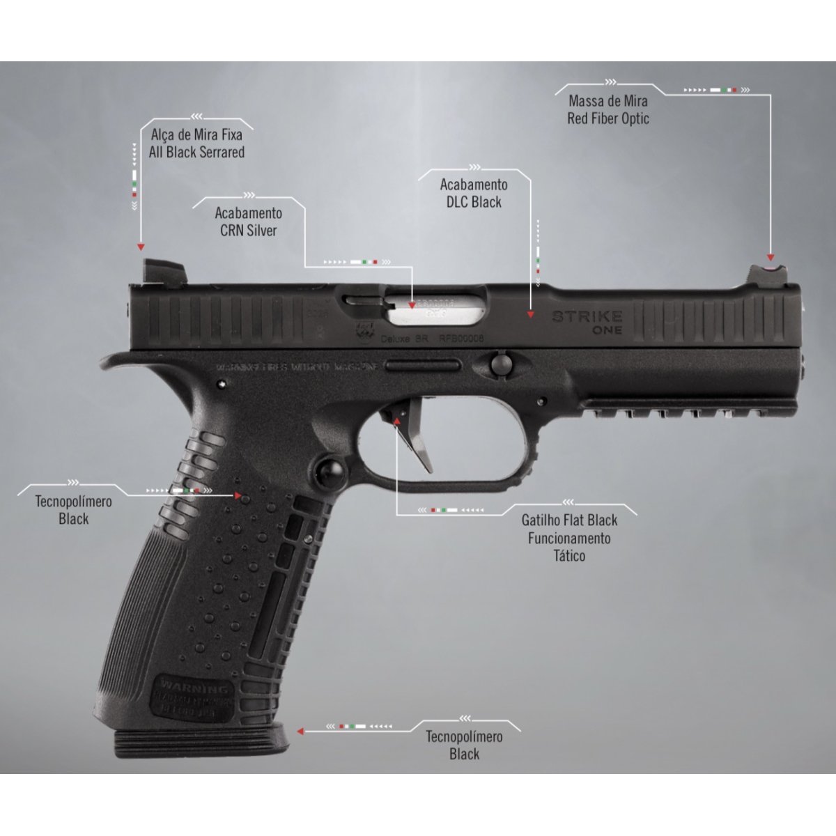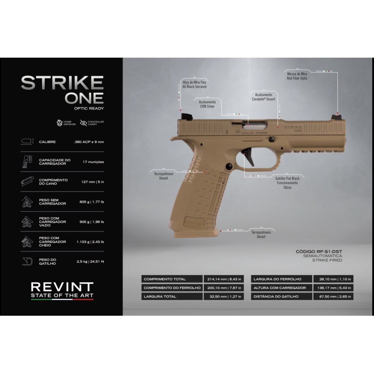 PISTOLA REVINT - STRIKE ONE - CAL. .380ACP - 17+1 TIROS (2 CARREGADORES) - CERAKOTE - CANO 5” - SEMIAUTOMÁTICA - PESO GATILHO 2.5KG - ITÁLIA